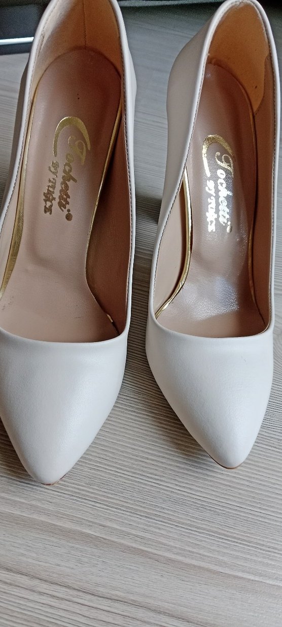 Beyaz renkli, bağcıklı tasarıma sahip, kauçuk malzemeden yapılmış stiletto topuklu ayakkabılar. Modern klasik tarzda, düğün için uygun, desensiz ve açık tonlarda.