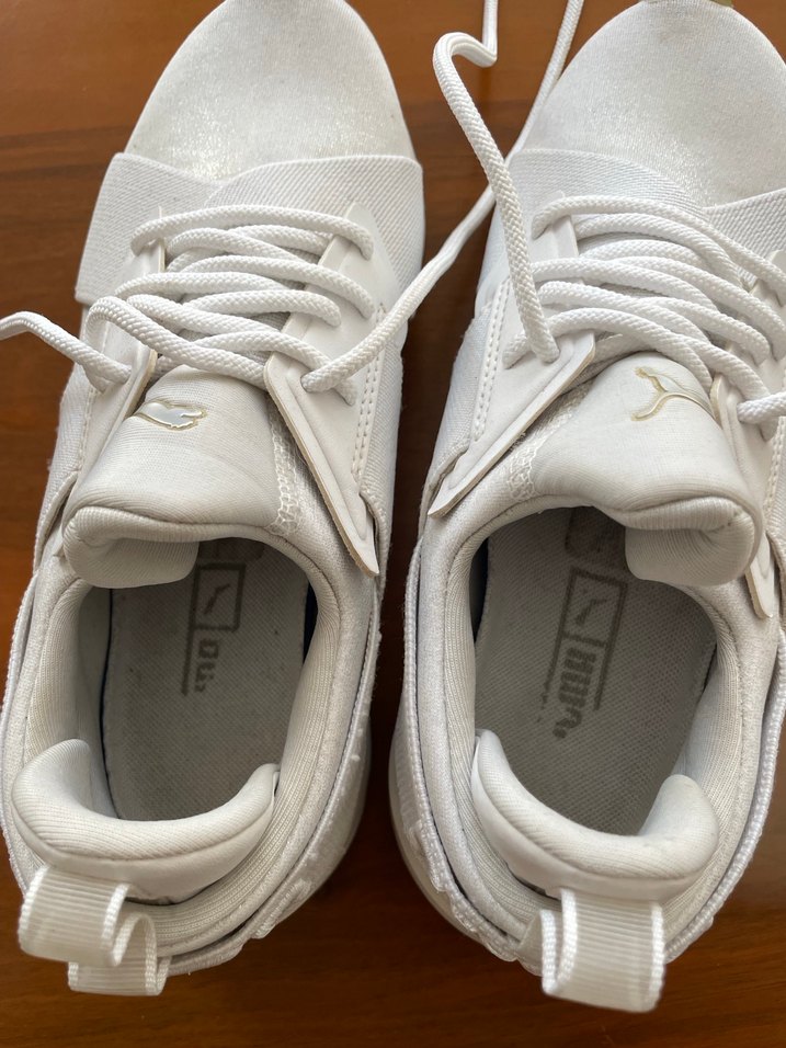 Bağcıklı, stiletto topuklu beyaz kadın spor ayakkabısı. İade yoktur. Parlak görünümlü ve kauçuk tabanlı, spor ve sokak stili için uygundur.