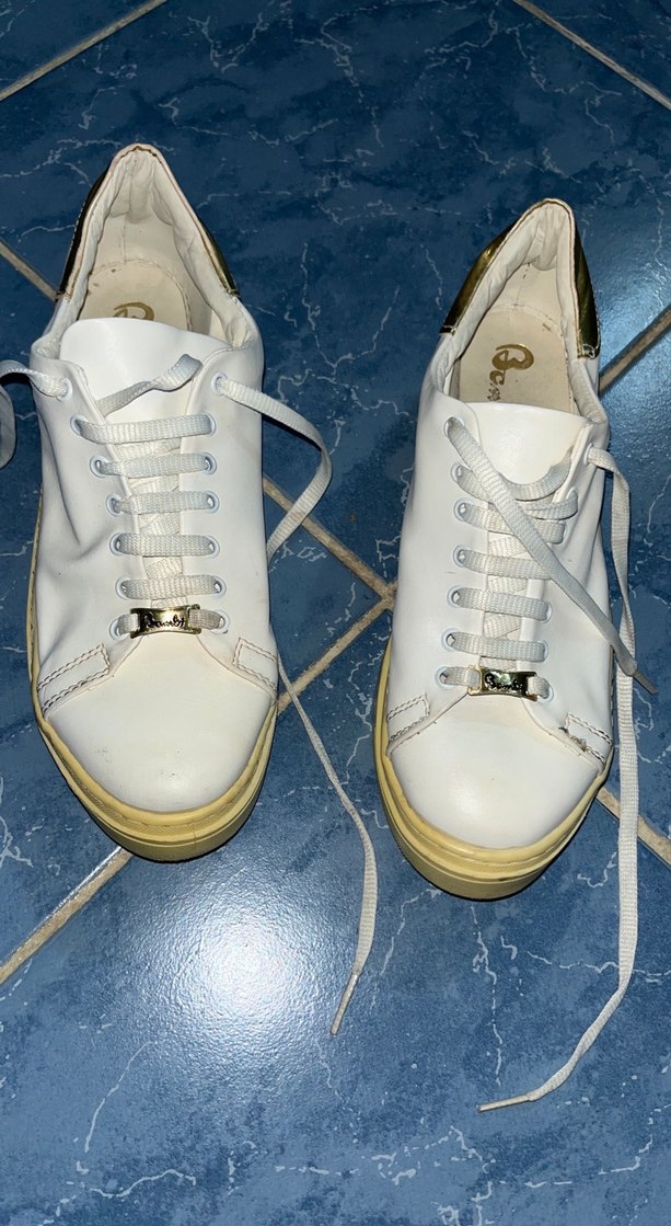 Beyaz, bağcıklı, stiletto topuklu kadın spor ayakkabısı. Parlak yüzeyli, kauçuk malzemeden, günlük kullanım için minimalist sokak tarzı.