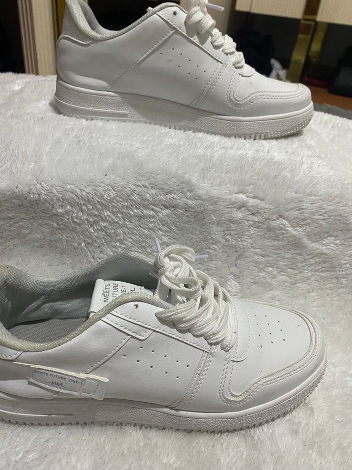 Beyaz bağcıklı spor ayakkabılar, ince stiletto topuk ve düz kauçuk taban ile günlük sokak stiline uyum sağlar. Desensiz, 1 kere giyildi