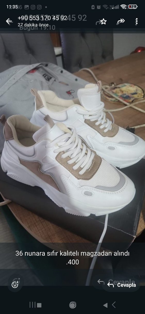 Beyaz bağcıklı, stiletto topuklu spor ayakkabı. Kauçuk malzemeden, açık renk ve desensiz tasarıma sahip, 36 numara.