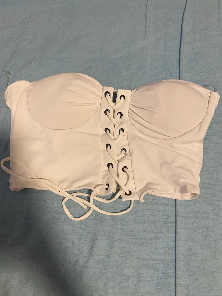 Beyaz, straplez, bel detaylı, bağcıklı ve vücuda oturan sentetik kumaş bustiyer.