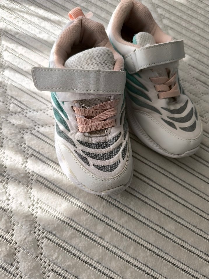 Beyaz ve pastel tonlarda batik desenli, cırt cırtlı ve kauçuk tabanlı kız çocuk spor ayakkabısı.