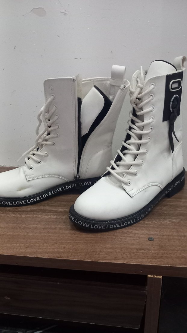Bağcıklı beyaz yüksek topuklu botlar, gri 'LOVE' yazılı taban detaylarıyla günlük ve sokak stiline uygun.