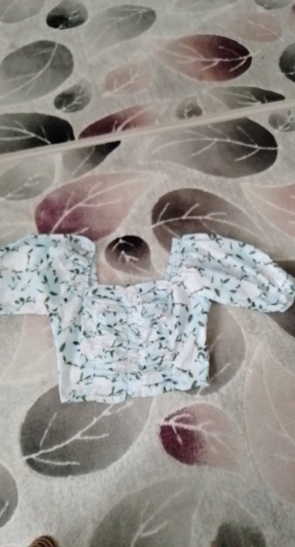 Beyaz zemin üzerinde pastel bağlama desenli, uzun kollu, balıkçı yaka ve fırfırlı mini kesim dar kadın bluzu.