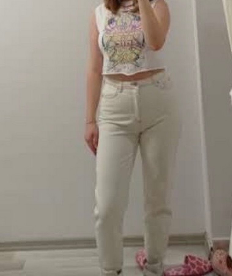 Beyaz pamuklu jean, rahat kesimi ve hafif bağlama desenleriyle günlük şıklık sunar.