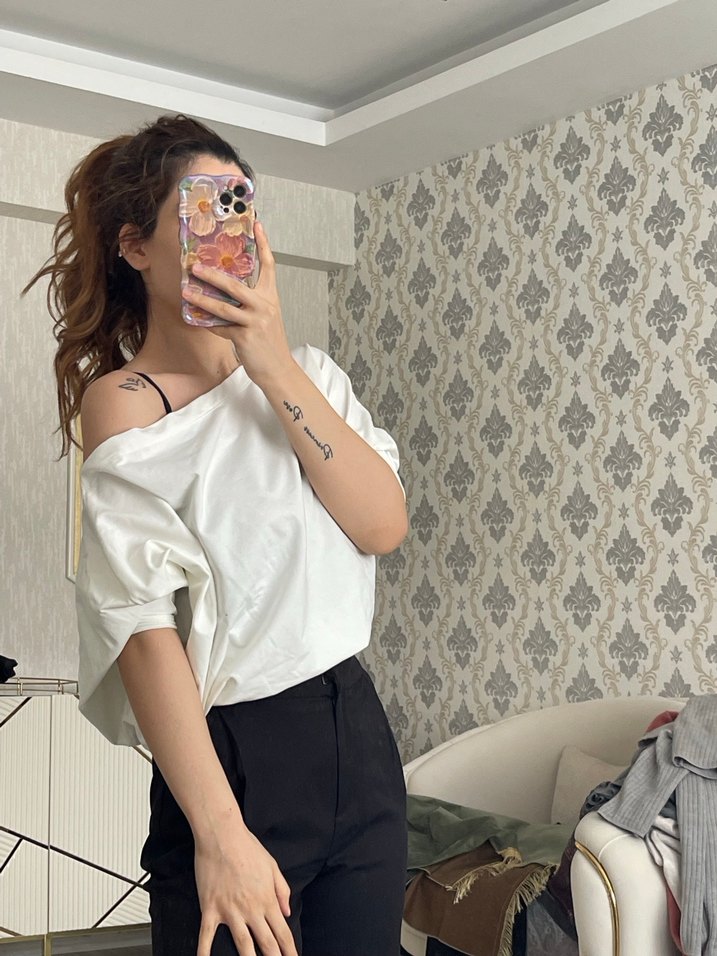 Pamuklu beyaz bluz, straplez yaka ve kısa kollu, rahat kesimiyle bağlama desenli. Günlük sokak stiline uygun, zahmetsiz şıklık sunar.