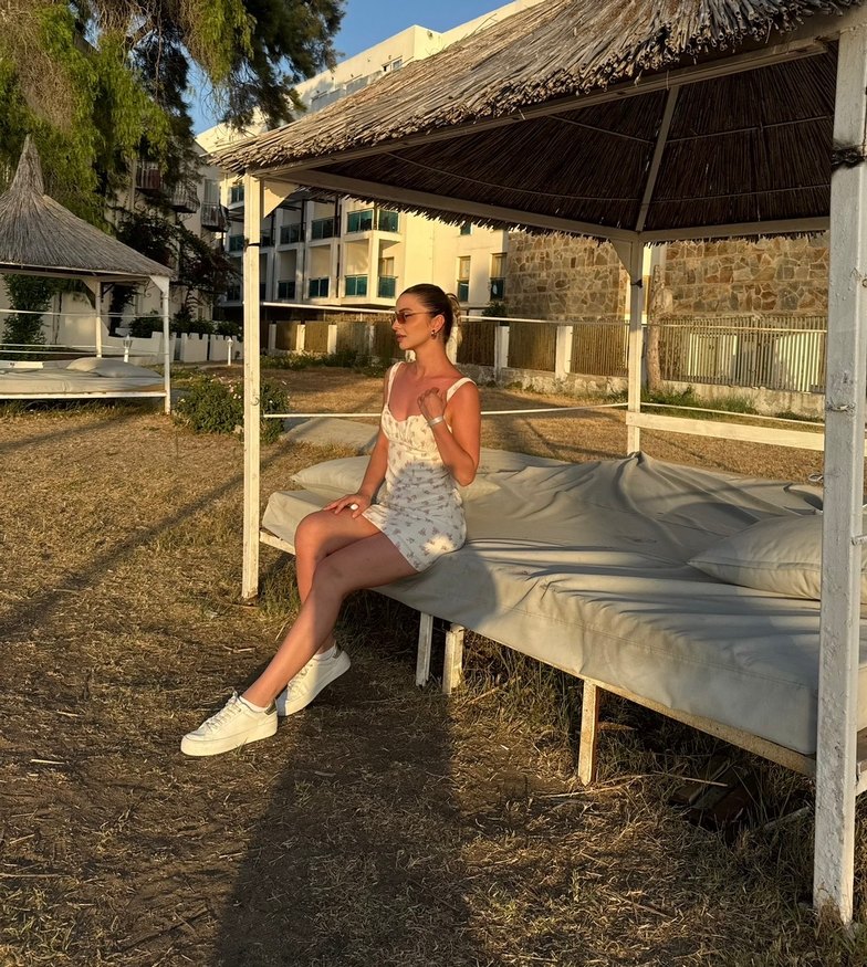 Pamuk kumaştan, straplez yaka ve drapeli tasarıma sahip beyaz mini tulum, hafif batik deseniyle bohem plaj stiline uygun.