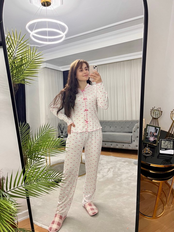 Uzun kollu, beyaz bağlama detaylı ve pastel tonlarda bağlama desenli, bol kesim pijama takımı. Rahat ve konforlu.