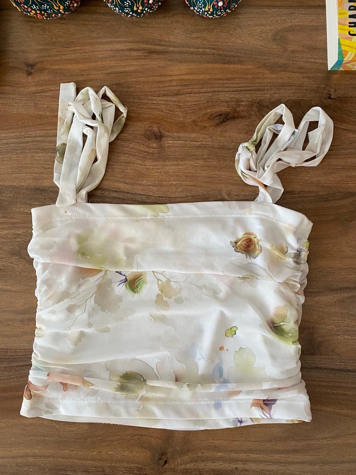 Beyaz, bağlamalı askılı, drapeli tasarıma sahip, pastel tonlarda batik desenli, vücuda oturan mini büstiyer.