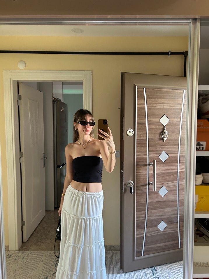 Beyaz pamuk midi etek, bol kesim ve bağlamalı batik desenle günlük kullanıma uygun rahat ve şık bir görünüm sunar.