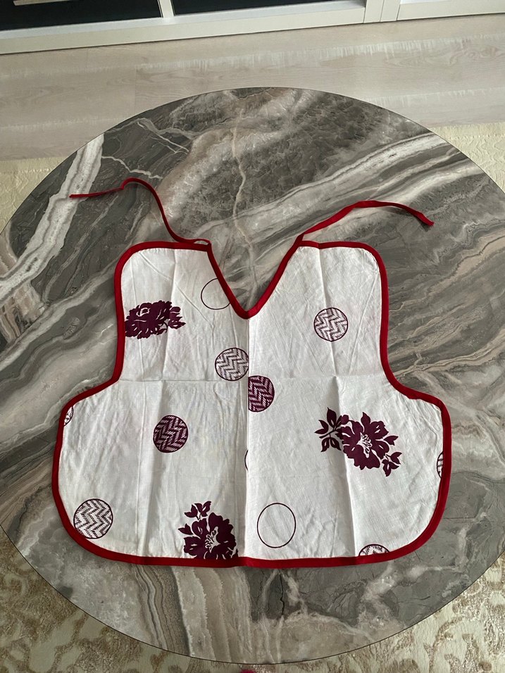 Koyu bağlamalı desenli beyaz bebek önlüğü, kırmızı kenarları ve bağlama ipleri ile.