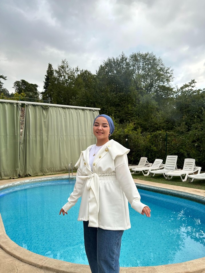 Pamuk kumaştan, bağlamalı ve uzun kollu beyaz kadın yağmurluğu. Yüksek yakalı, rahat kesimli ve hafif batik desenlidir. Günlük kullanıma uygundur. ️