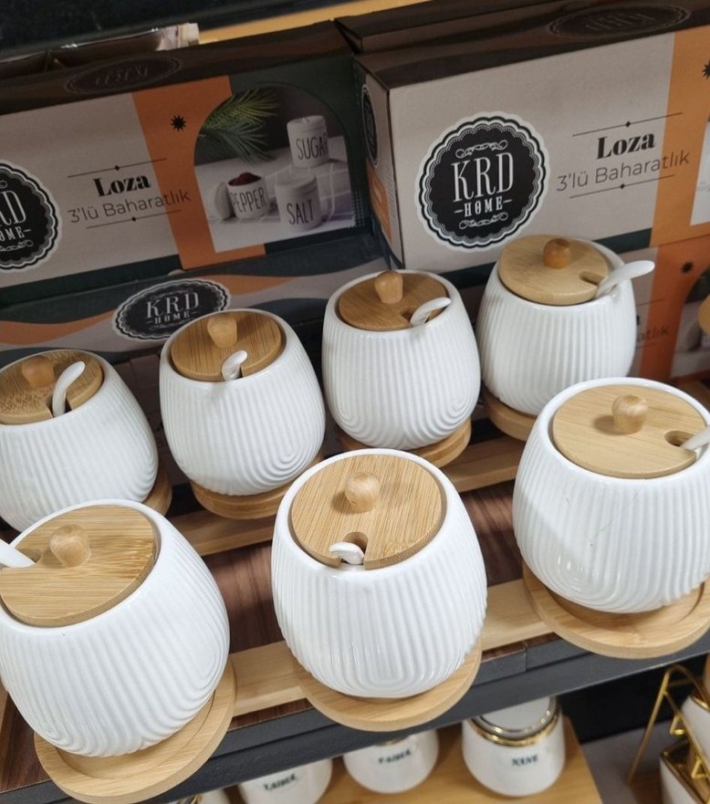 beyaz baharat takımı, ahşap kapaklı ve kaşıklı seramik kaplarla birlikte ahşap tepsi üzerinde sunulur.