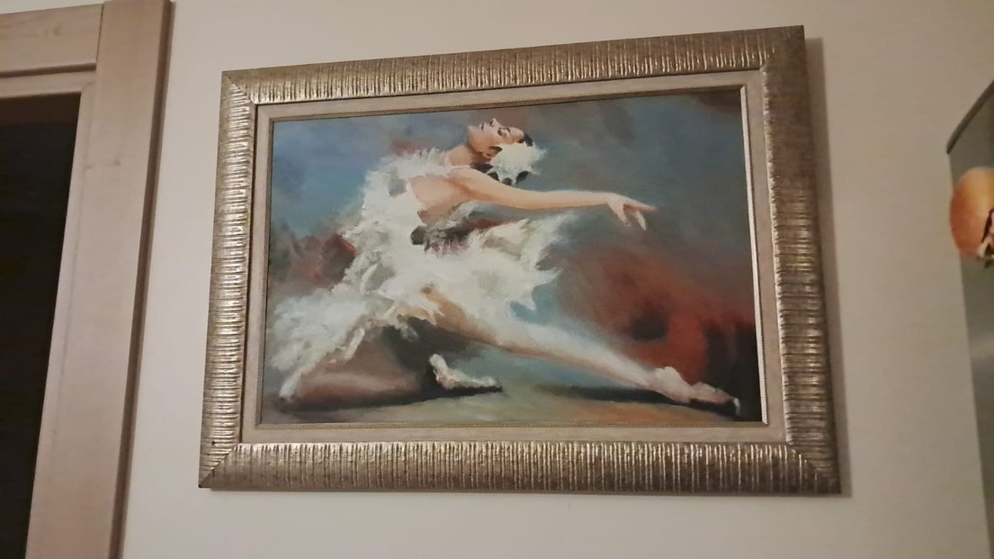 Hafif tonlarda, beyaz bale figürünü dinamik bir pozda gösteren tablo.