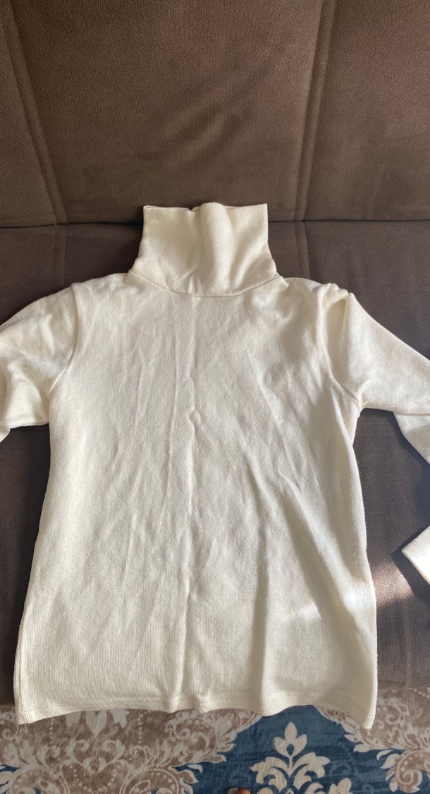 Beyaz balıkçı yaka, uzun kollu kadın kazak. Yumuşak ve sıcak kumaştan, rahat ve sade sokak stili için uygun.