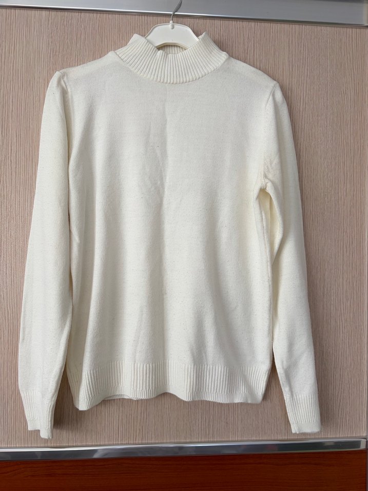 Beyaz balıkçı yaka, uzun kollu kadın kazak, yumuşak örme kumaştan, düz ve sade tasarıma sahip, günlük kullanım için uygundur.