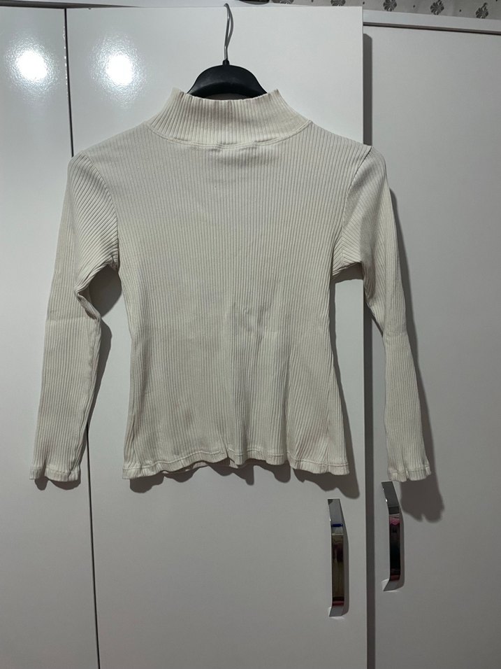 Beyaz renkli, balıkçı yakalı ve uzun kollu, ince keten kumaştan yapılmış, sade ve minimal kesim kadın triko. Günlük kullanıma uygundur.
