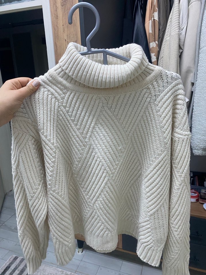Beyaz balıkçı yaka, uzun kollu örgü kadın kazak, salaş kesim ve sade desene sahip, günlük rahat kullanıma uygun.