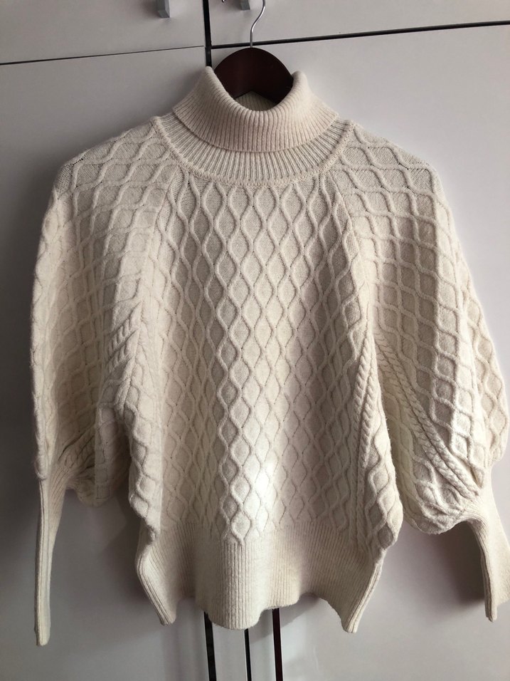 Beyaz örgü kazak, balıkçı yaka ve uzun kolludur. Rahat ve bol kesimiyle günlük kullanıma uygun, modaya uygun ve özgün bir tasarıma sahiptir.