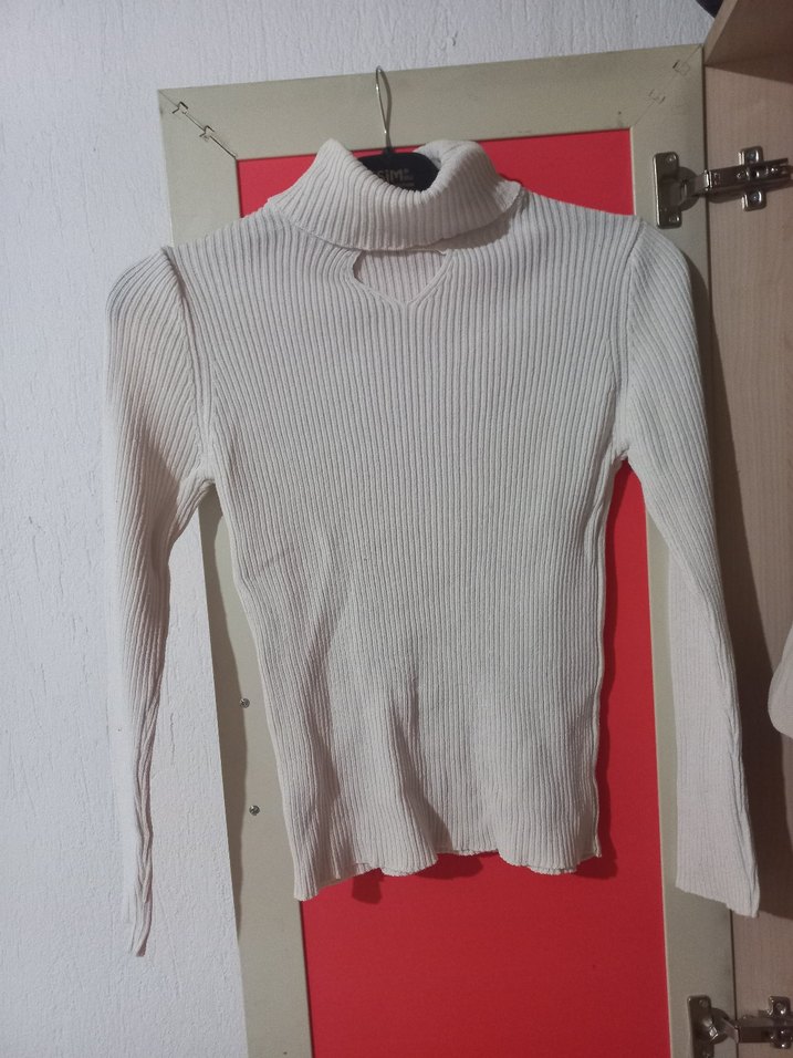 Beyaz, balıkçı yaka ve uzun kollu, vücuda oturan triko kazak, günlük sokak giyimi için uygundur.