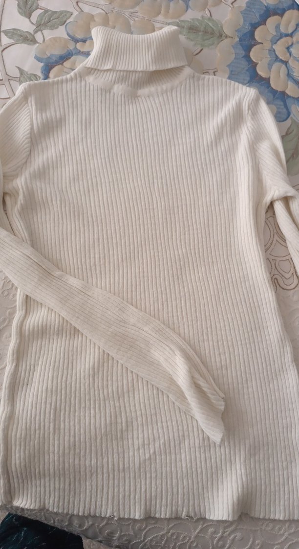 Beyaz renk, balıkçı yaka ve uzun kollu, fit kesim örme kadın kazak. Düz ve rahat dokusu günlük kullanıma uygundur.