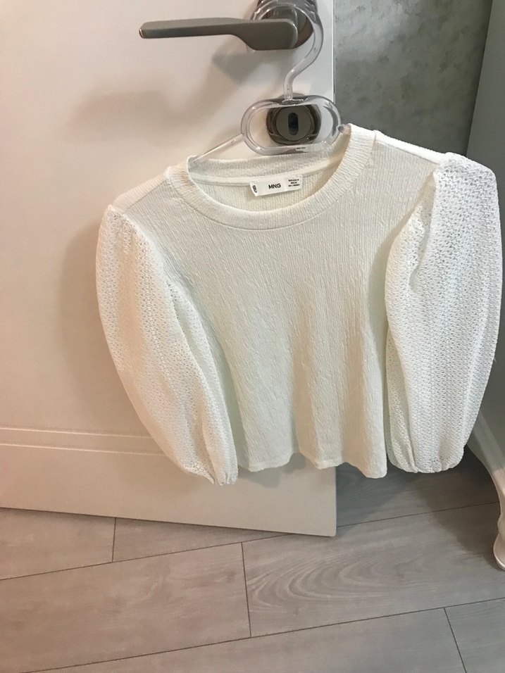 Beyaz balon kol , yuvarlak yaka ve uzun kollu, yumuşak kumaştan yapılmış kısa bluz. Rahat sokak stili için uygun.