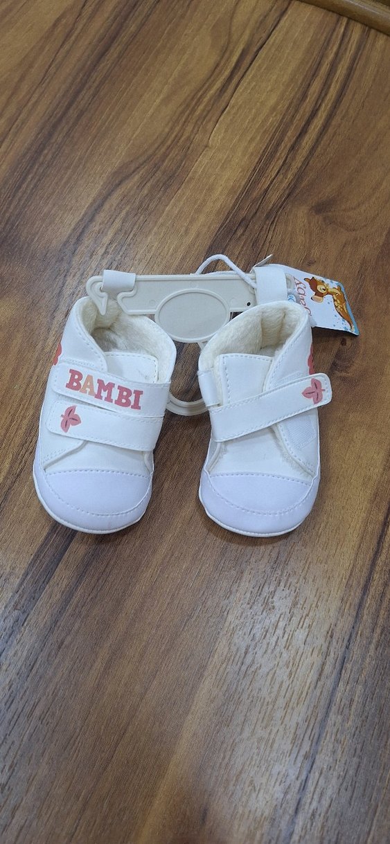 Beyaz kauçuk ilk adım ayakkabısı, renkli baskılı detaylara sahip. Kolay kullanım için Velcro bantlı, sokak stili. Üzerinde BAMBI yazısı bulunur. hic kullanilmadi etiketli