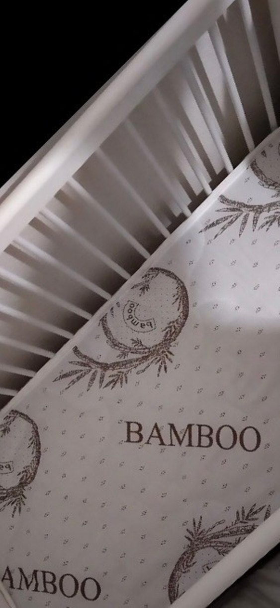 Gri bambu desenli yumuşak ve nefes alabilen malzemeye sahip beyaz bebek beşiği. ️