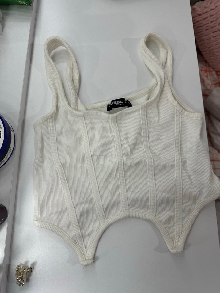 Yumuşak sentetik kumaştan, bantlı askılı ve straplez yakalı beyaz mini büstiyer. Günlük sokak stili için uygun, desensiz ve kısa boyda. ✨
