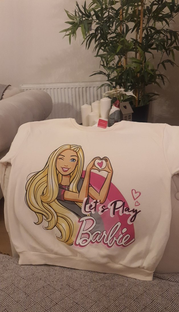 Uzun kollu, yuvarlak yaka ve bol kesim beyaz sweatshirt. Renkli Barbie baskısı ile rahat ve şık sokak stili için uygun.