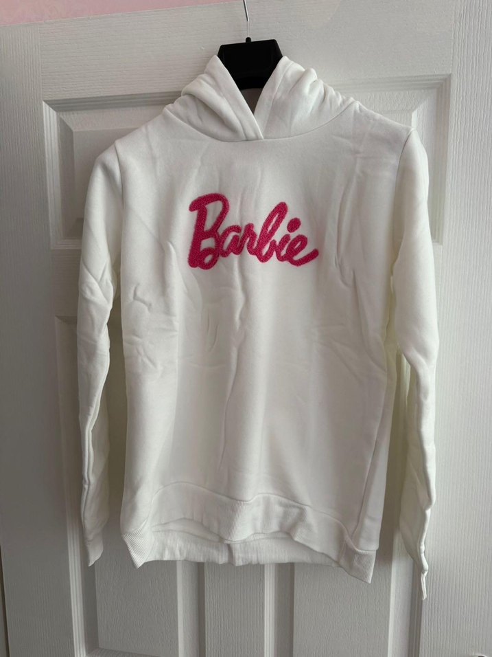 Yumuşak fleece kumaştan, bol kesim beyaz kapüşonlu sweatshirt. Üzerinde pembe Barbie baskısı bulunur. Rahat günlük sokak stili için uygun.