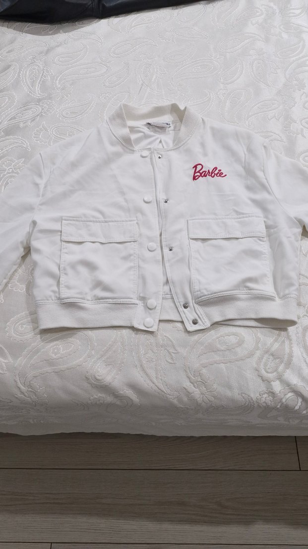 Pamuklu, uzun kollu, yuvarlak yakalı beyaz bolero. Düğmeli ve nakışlı Barbie detaylı, rahat kesim, gündelik şıklık için uygun.