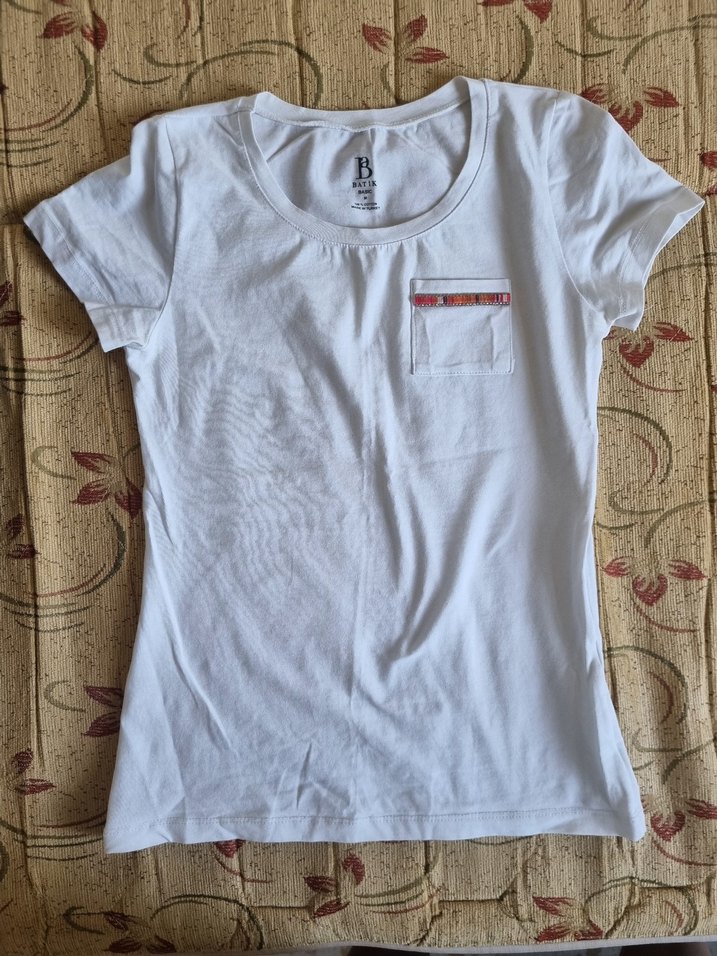 Pamuklu kumaştan, kısa kollu ve bisiklet yakalı beyaz tişört. Göğüs cebinde küçük baskı detayı bulunur, şık sokak stili için uygundur. Koltuk altlarında herhangi bir sararma yoktur.