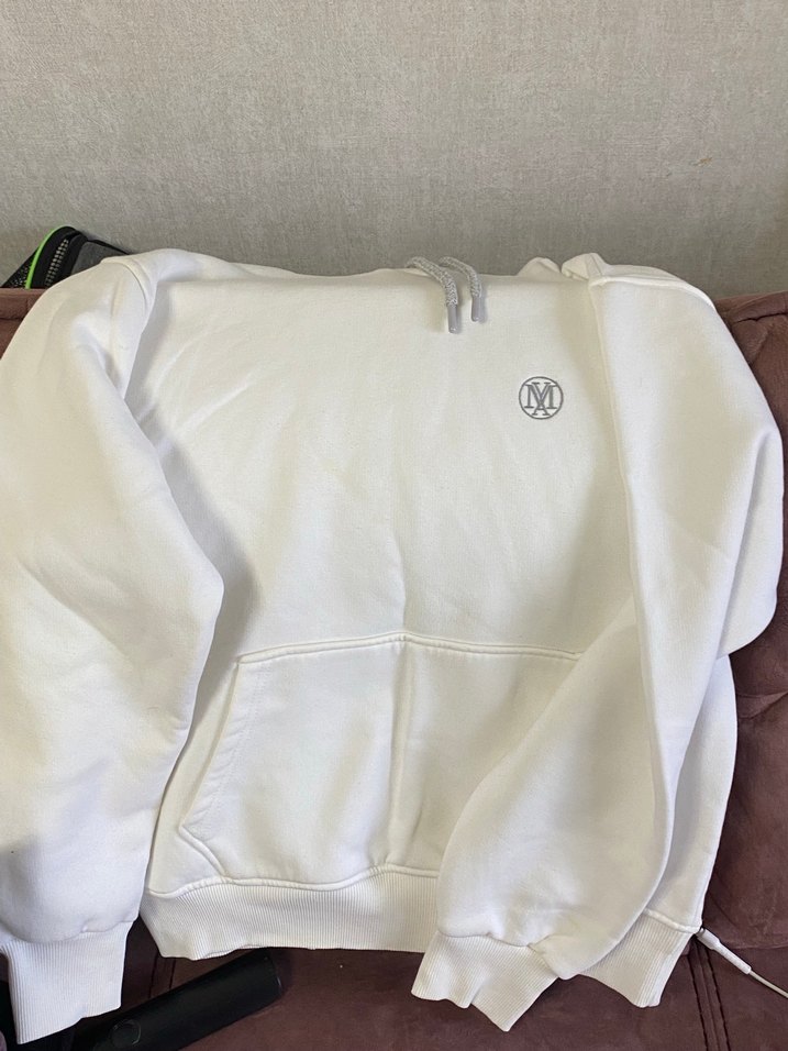 crew yaka ve uzun kollu, bol kesim, normal boyda beyaz basic sweatshirt. Yumuşak kumaştan, sade ve desen içermeyen tasarımıyla günlük kullanıma uygun, gri logo detaylı. Gözüken lekeler mevcut