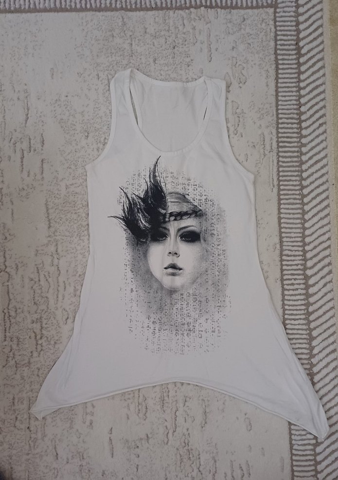 Beyaz renkte, avant-garde yüz baskılı, asimetrik drapeli kısa kesim kadın atlet, yumuşak sentetik kumaştan, bol kesimdir.
