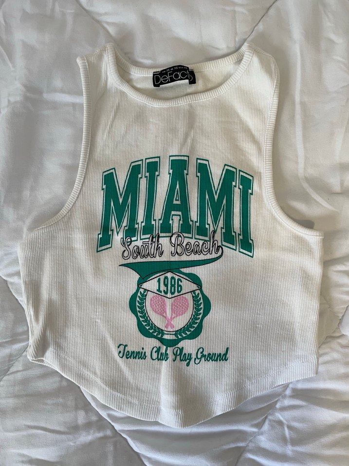 Pamuklu, beyaz, baskılı MIAMI yazılı, atlet kesim, bisiklet yaka, normal midi uzunlukta, kemer detaylı, sportif ve sokak tarzı için uygun bir parça.