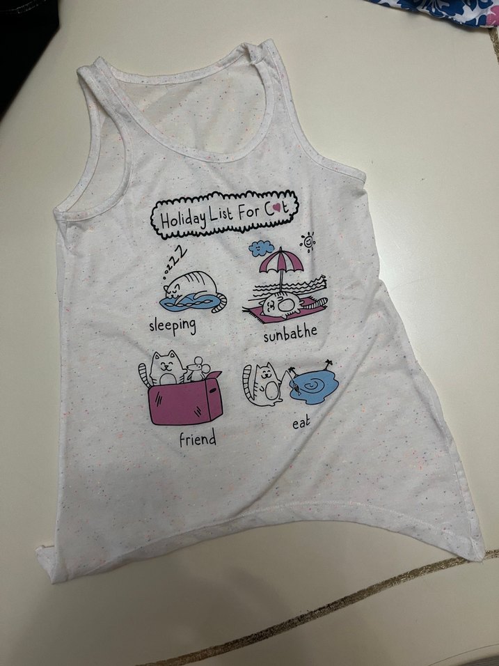 Pamuklu, beyaz, baskılı. Kolsuz, bol kesim ve yuvarlak yaka, günlük rahat kullanım için uygundur.