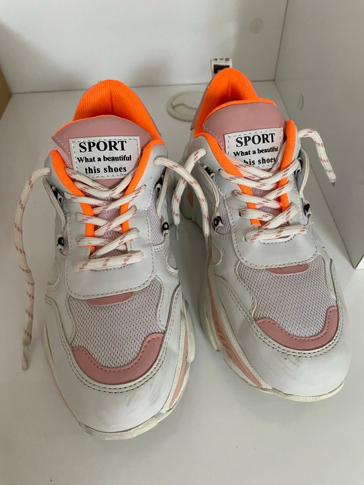 Beyaz baskılı ve pastel detaylı, bağcıklı tasarıma sahip, stiletto topuklu ve kauçuk tabanlı kadın spor sneaker. ♀️