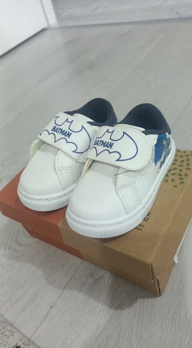 Beyaz tabanlı, renkli Batman baskılı, kauçuk malzemeden yapılmış, cırt cırtlı erkek çocuk spor ayakkabısı. Sokak stiline uygun.