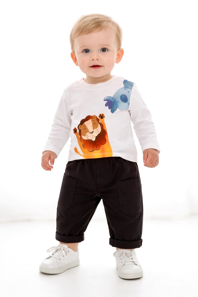 Beyaz uzun kollu, aslan ve kuş baskılı polar kumaş üst ile siyah, 6-9 ay olarak bedeni bulunmaktadır