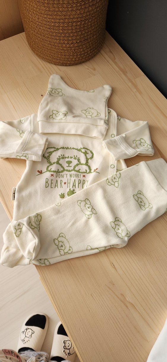 Yumuşak ve sıcak kumaştan, bohem tarzda bebek erkek takımı. Uzun kollu bisiklet yaka üst, pantolon ve örgü şapka, ayı desenleri ve 'Don't Worry Bear Happy' yazısı ile. yenidogan uclu takim elleri eldiven olabiliyor 1 kez giydirdm kucuk geldi sorunsuz