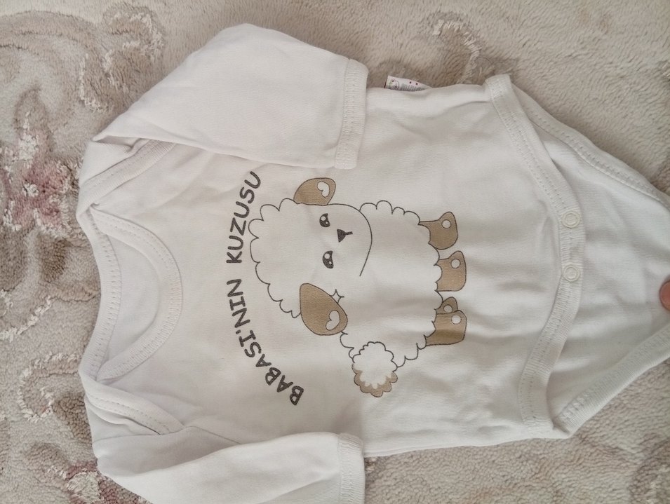 Beyaz renkte, üzerinde sevimli kuzu baskısı ve "BABASININ KUZUSU" yazısı bulunan çocuk içliği. Yumuşak kumaştan üretilmiştir. çıtçıtlı