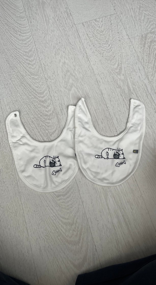 Gri baskılı kedi desenli beyaz 2'li bebek önlüğü seti, kolay kapanan çıtçıtlı, yumuşak ve rahat kumaşlı.