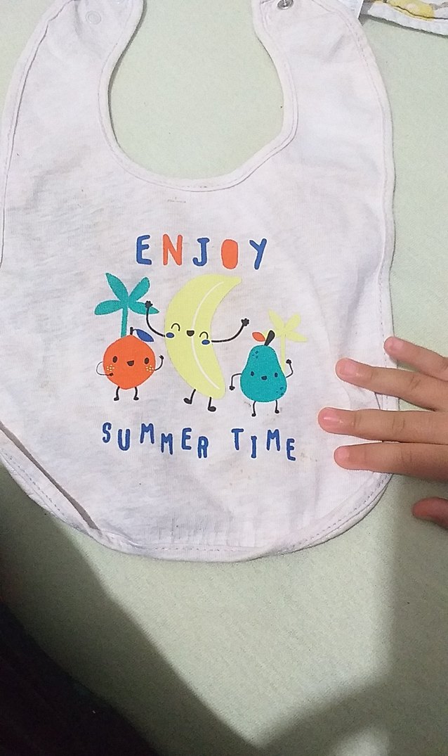 Beyaz renkli, baskılı ve pastel tonlarında meyve figürlü bebek önlüğü, yumuşak ve rahat kullanım sağlar.arkasi şu gecirm3z