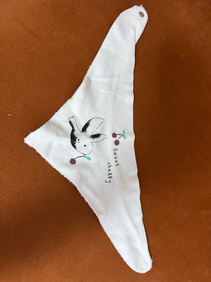 Beyaz renkli, baskılı tavşan ve kiraz desenli bebek önlüğü. Pastel tonlarda, kolay kullanımlı çıtçıtlı kapanışa sahiptir.