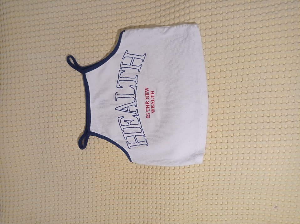 Beyaz renkte, lacivert kenarlıklı ve "HEALTH is the new WEALTH" yazılı baskılı bebek önlüğü. Yumuşak kumaştan yapılmıştır.
