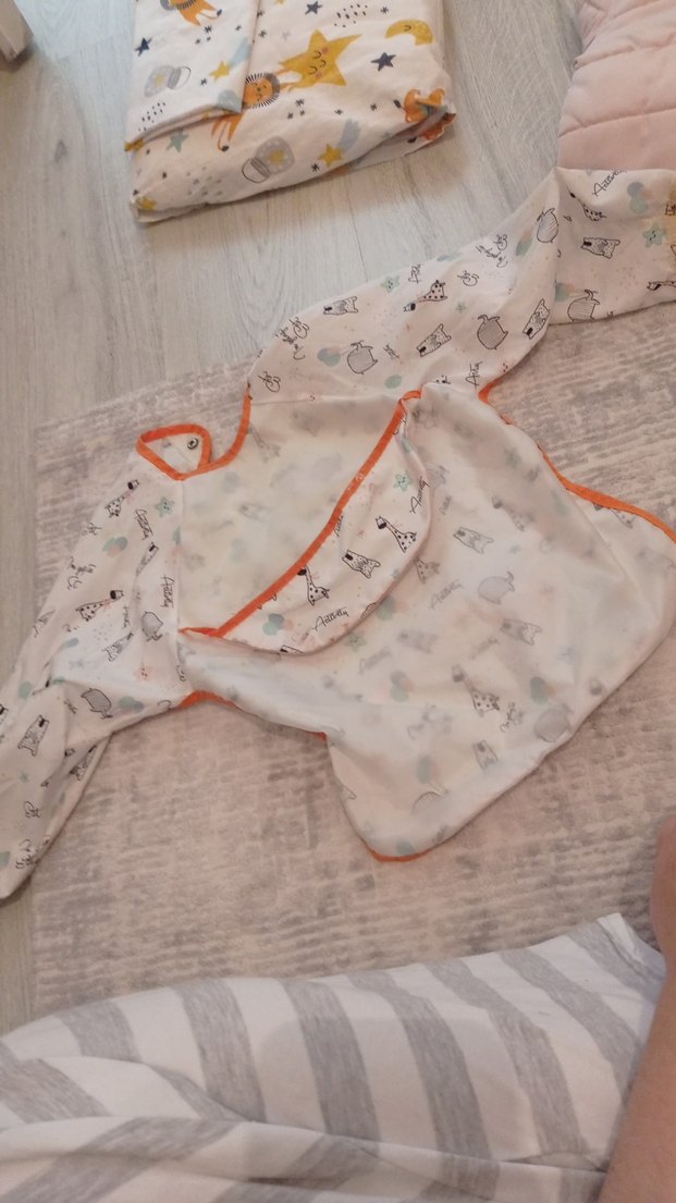 Beyaz zemin üzerinde pastel renklerde hayvan desenleri bulunan, turuncu şeritli bebek önlüğü. Beslenme sırasında temiz tutar.
