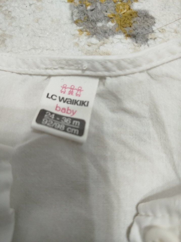 LC Waikiki'den baskılı desenli beyaz bebek önlüğü, yaklaşık 98 cm beden için uygundur. Yumuşak kumaşıyla rahat kullanım sağlar.