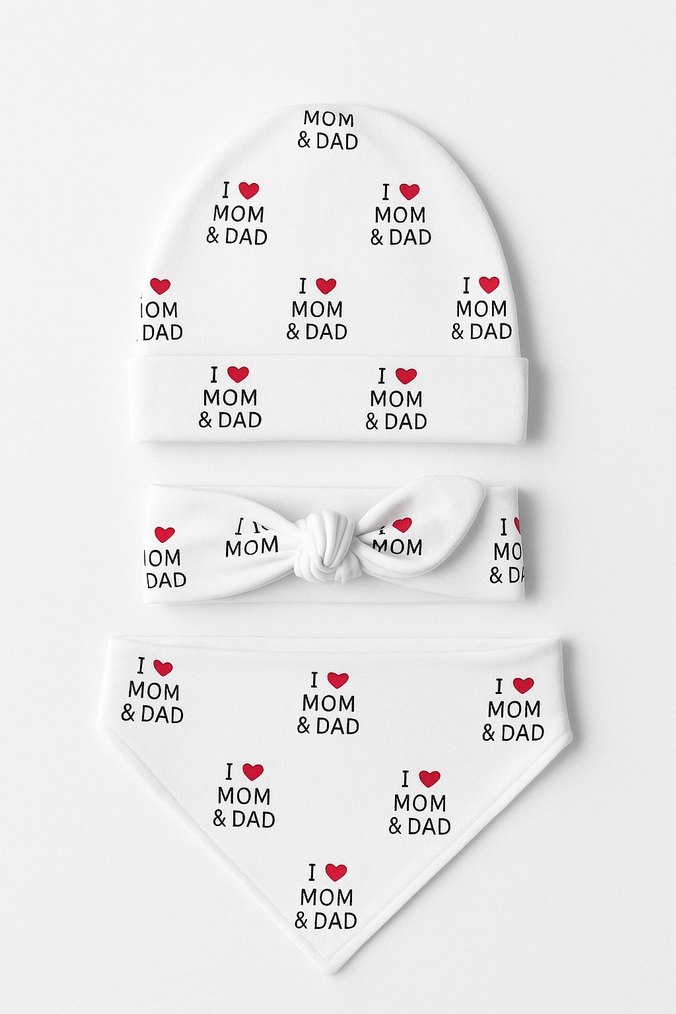 Beyaz zeminde "I ❤️ MOM & DAD" yazılı baskılı önlük, şapka ve düğümlü saç bandından oluşan bebek seti. ❤️ 0-2 yaş için uygundur